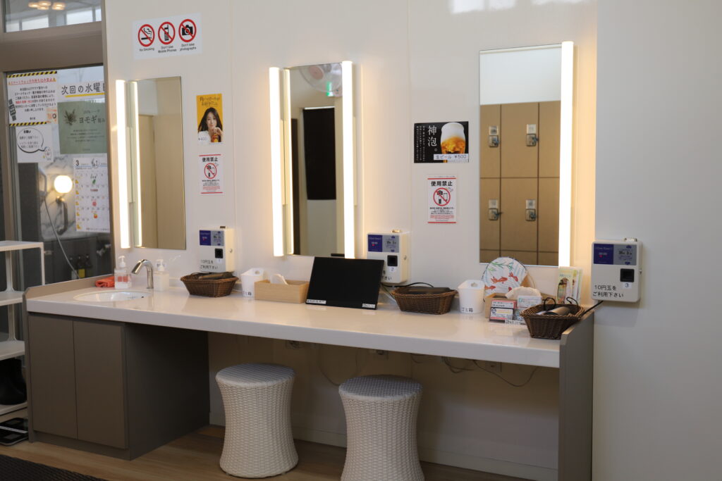 女風呂脱衣所には大きな鏡と女優ライトも完備され、至れり尽くせりだ。